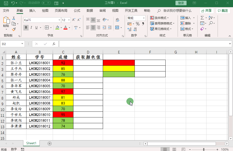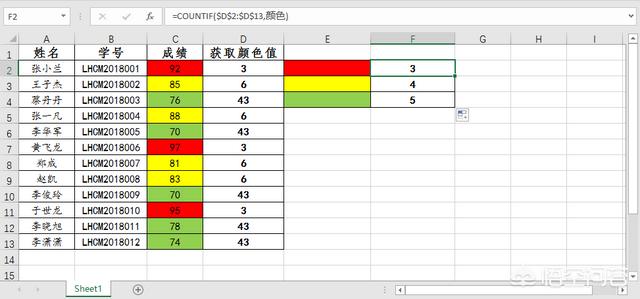 注意:使用COUNTIF函数利用“颜色”这个自定义的名称作为判断条件,在提取了E2:E4单元格区域的背景色参数后,对比D2:D13单元格区域颜色值的参数。