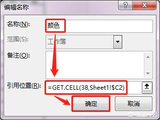 2、弹出“新建名称”对话框 — 在“名称”中输入“颜色”– 在“引用位置”输入“=GET.CELL(38,Sheet1!$C2)”– 点击“确定”按钮。