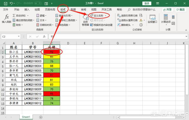 1、选中C2单元格 — 点击菜单栏的“公式”选项卡 — 点击“定义名称”。