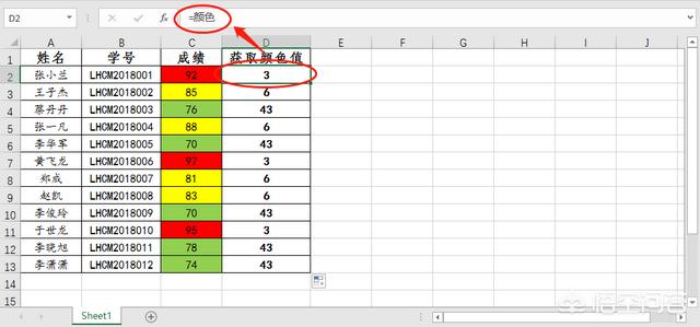 3、在D2单元格中输入“=颜色”– 可以看到单元格返回颜色值的代码为3 — 选中D2单元格 — 鼠标移到单元格右下角出现“十”时往下填充至D13单元格。
