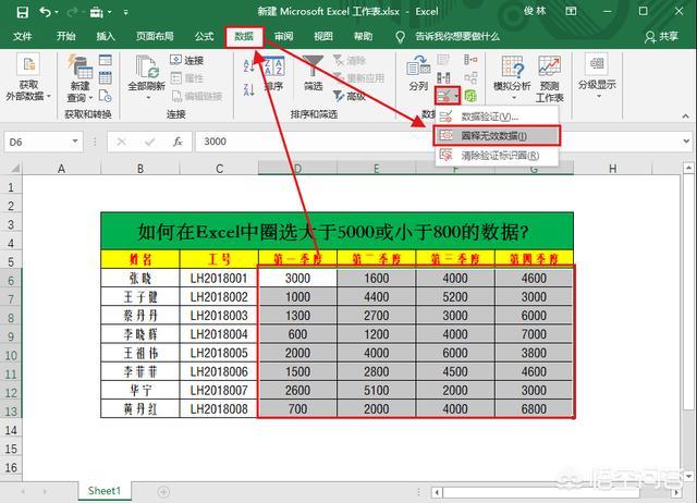 3、再次选中D6:G13单元格 — 点击菜单栏的“数据”选项卡 — 在“数据工具”组中点击“数据验证”– “数据验证”– “圈选无效数据”。