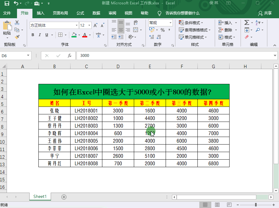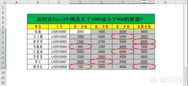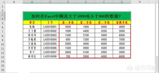 如何在Excel中圈选出大于5000或小于800的数据呢?下面这张图中,我们要从D6:G13单元格区域中圈选出大于5000或小于800的数据。