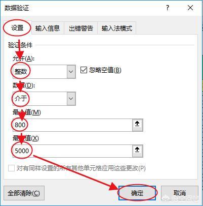 2、弹出“数据验证”对话框 — 在“允许”栏选择“整数”–“最小值”输入“800”– “最大值”输入“1500”– 点击“确定”按钮。