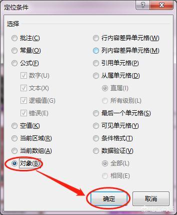 2、弹出“定位条件”对话框 — 选择“对象” — 点击“确定”按钮。