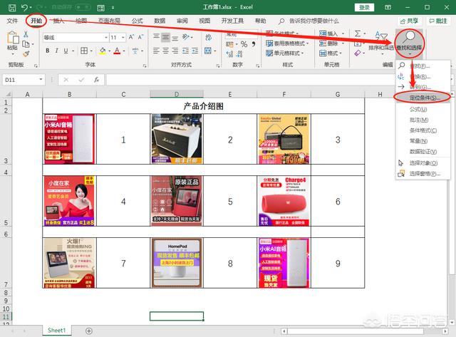 1、打开一份有很多图片的Excel表 — 点击菜单栏的“开始”选项卡 — 点击“编辑”组中的“查找和选择” — 在弹出的下拉菜单中点击“定位条件”(或直接按快捷键“Ctrl+G”)。