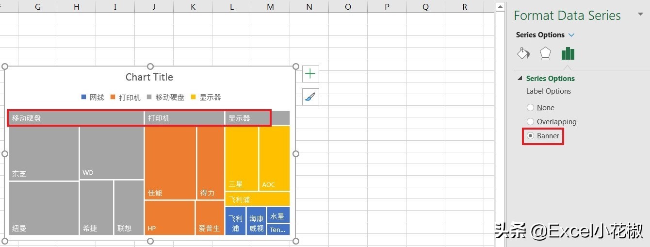 4. 在右边出现的对话框中选择 Series Options –> Banner,可以看到左边树状图的每一个色块上方已经出现了横幅名称,它是“产品名”,也是“品牌”的上一级目录