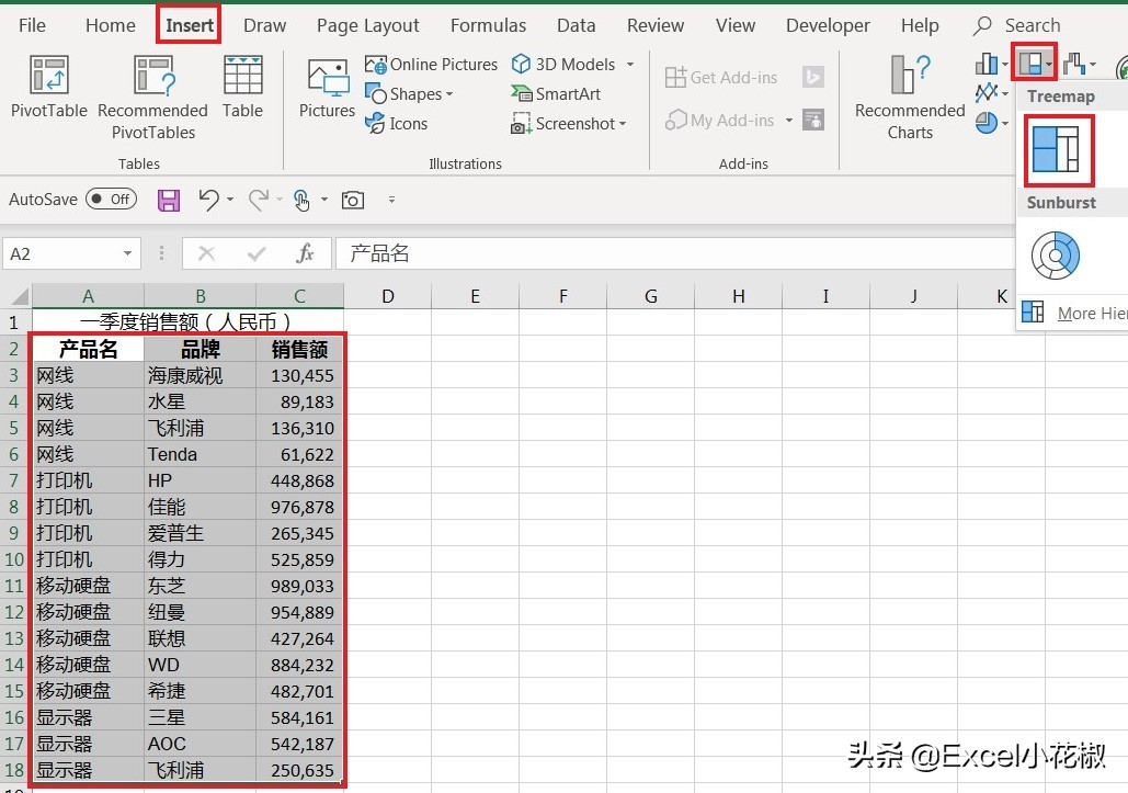 1. 全选数据表格区域 –> 选择菜单栏的 Insert –> Charts –> Treemap