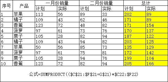 方法:在目标单元格中输入公式:总销量=SUMPRODUCT((E2:E11=B16)*C2:C11)、总销售额=SUMPRODUCT((E2:E11=B16)*C2:C11*D2:D11)。