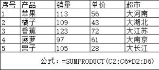 解读:公式=SUMPRODUCT(C2:C6,D2:D6)可以理解为:C2*D2+C3*D3+……C6*D6,暨对应的同一行单元格乘积的和。
