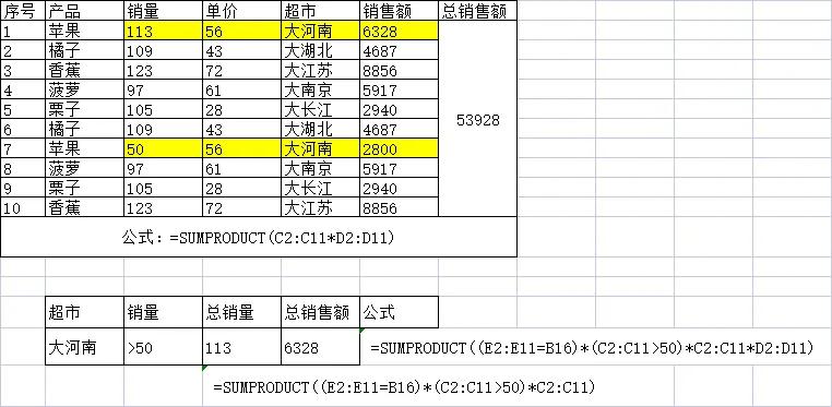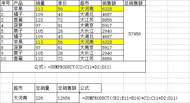 2、以“大河南”超市为例:总销量的公式=SUMPRODUCT((E2:E11=B16)*C2:C11)的计算过程就是:113+113=226。总销售额的公式:=SUMPRODUCT((E3:E9=H3)*C3:C9*D3:D9)的计算过程就是:113*56+113*56=12656。