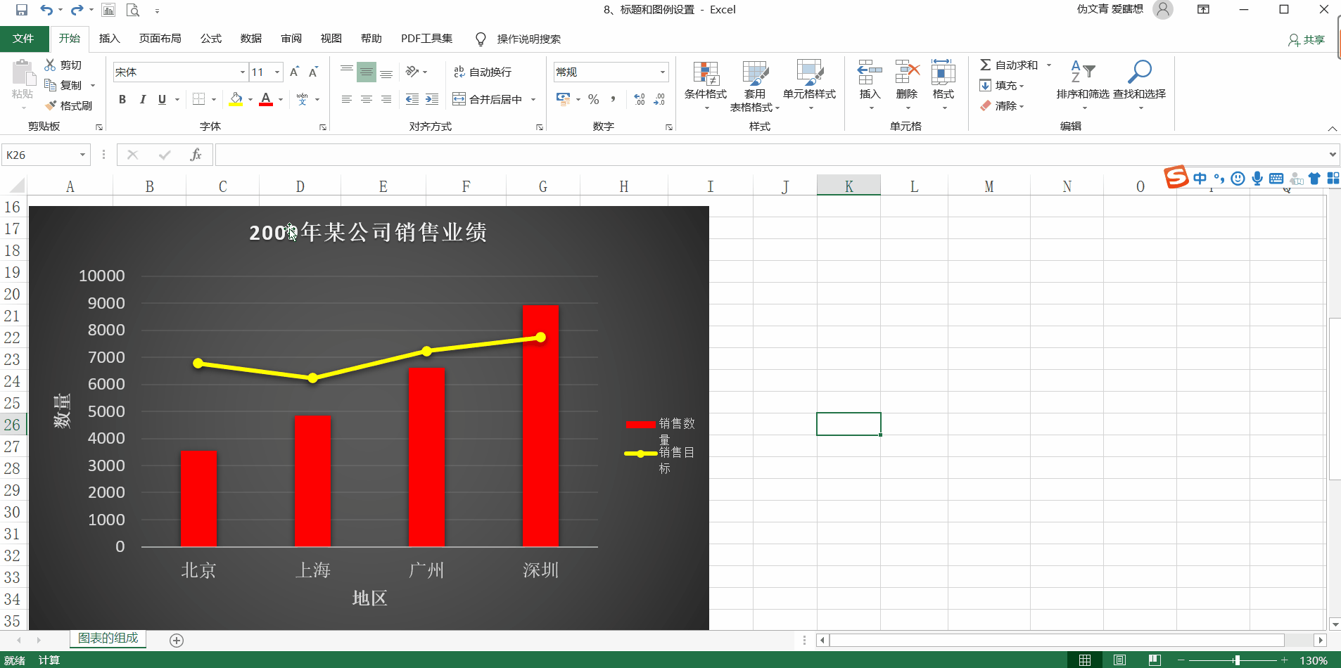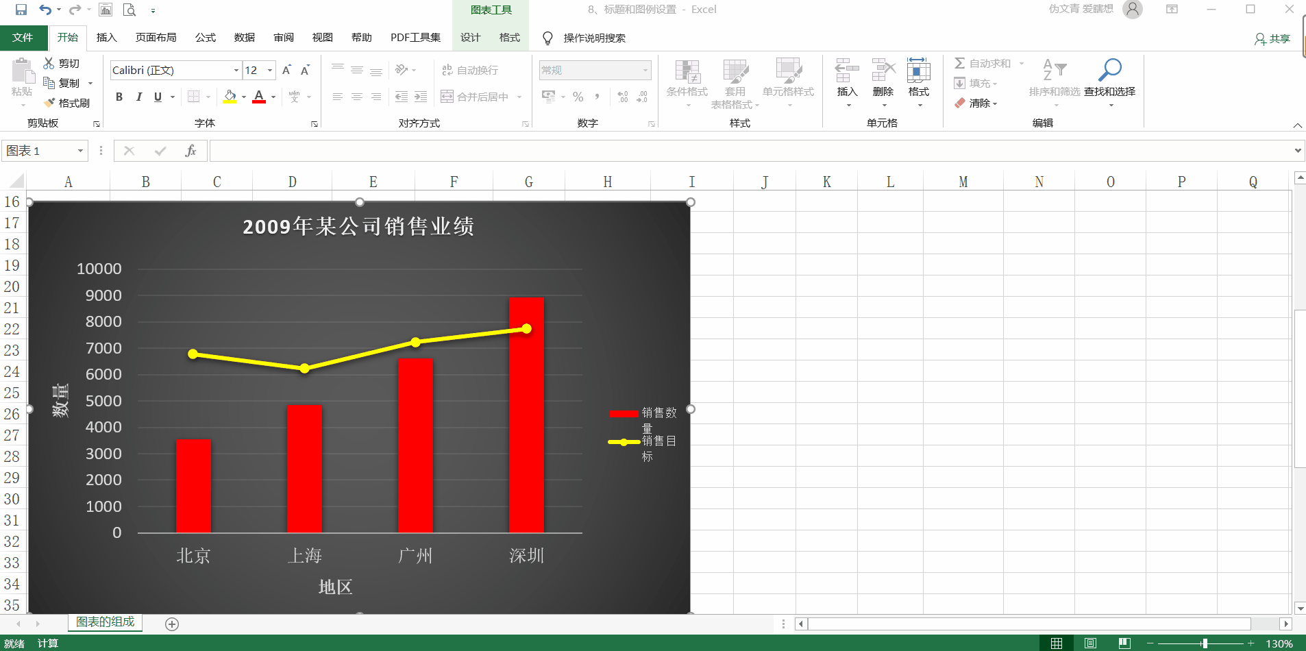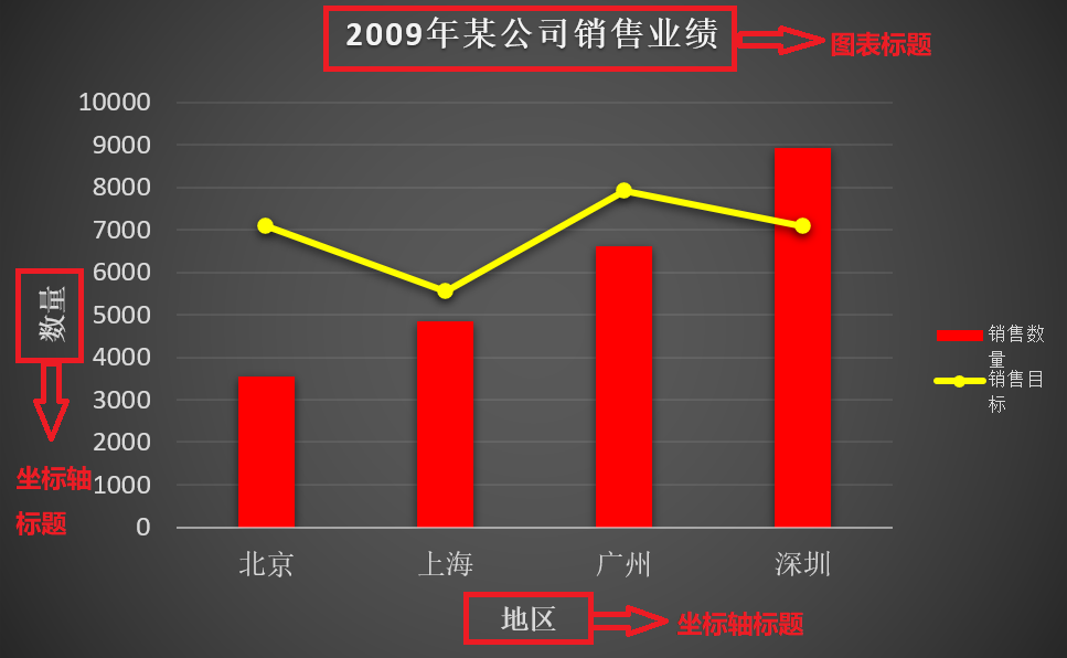 如上图,可以看到,“2009年某公司销售业绩”是图表标题,位于绘图区上方;“数量”和“地区”是坐标轴标题,为横纵坐标的内容进行了说明。