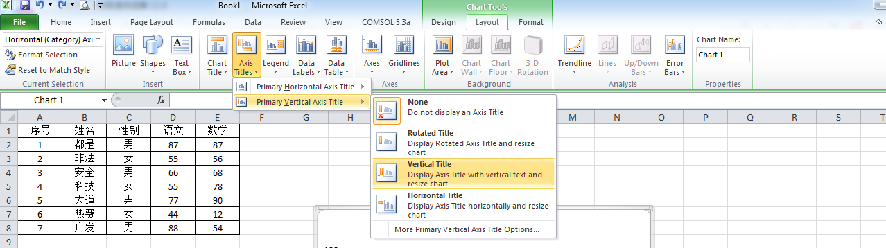 4.3 添加竖直轴标题,点击布局-轴标题-竖直轴标题-竖直标题