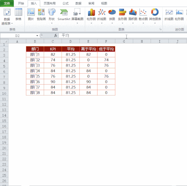 把高于平均值和低于平均值的数据分别提取到两列中,不符合条件的用0替代。这里可以用公式实现。