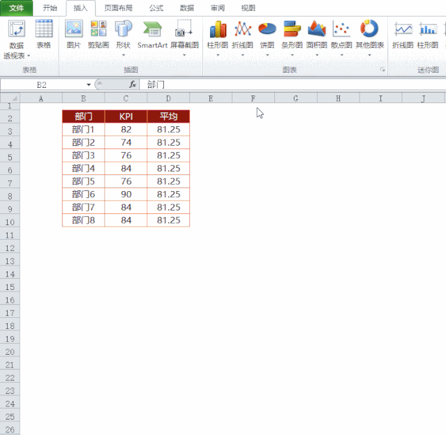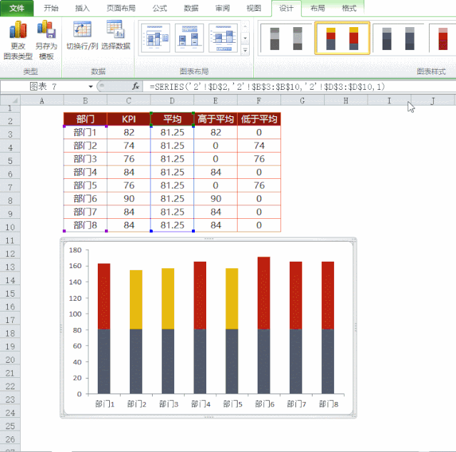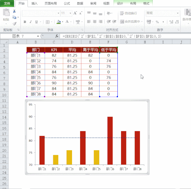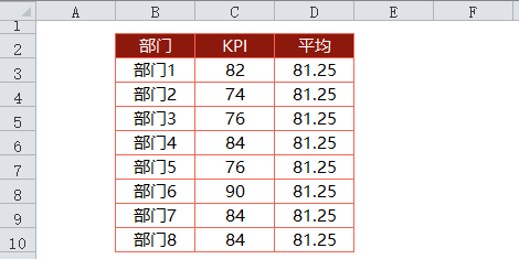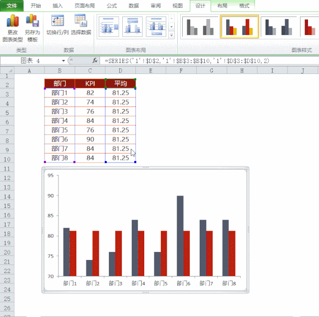 添加一列辅助数据,这列数为KPI的平均值。
