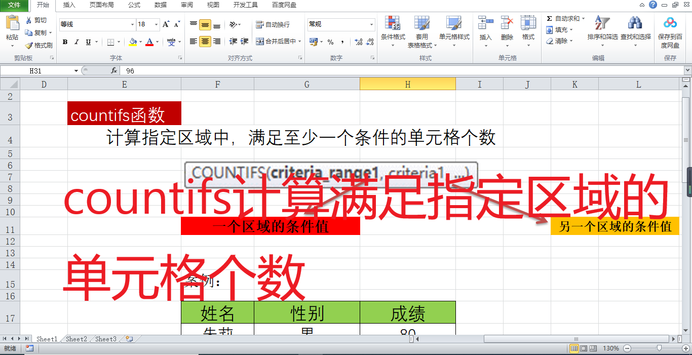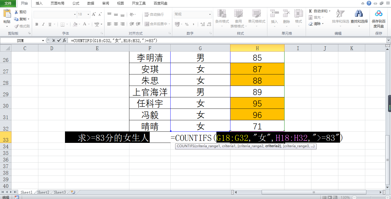 如图三所示,这样的一个计算过程,我们在进行函数求值的过程中,条件要求需要满足,在性别中满足女生,并且在分数中要达到>=83的这样一个要求,来进行单元格个数的求值的,这样的一个函数在Excel中的应用不多,大家只需要理解即可,给大家看一下这样的一个函数输入方式。