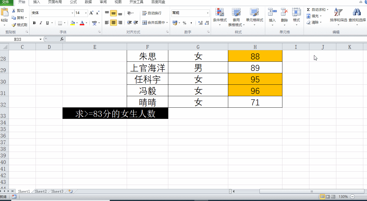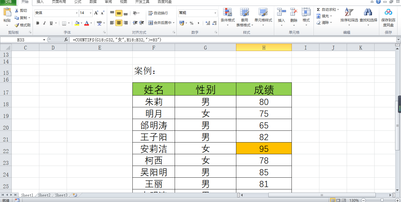 图二是这样的一个表格,根据它的一个题目要求,我们需要判断表格中求>=83分的女生人数,这样的一个要求呢,我们分析下肯定是需要countifs函数来进行求取一下,那我就通过具体的一个演示,给大家演示一下它的用法!