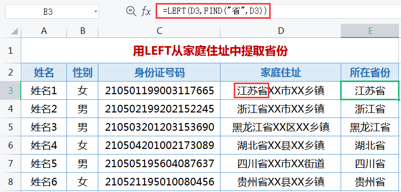 本例中,首先用FIND(“省”,D3)从D3单元格中提取“省”字所在的“位置数字”,然后再用LEFT(D3,“位置数字”)提取省份。