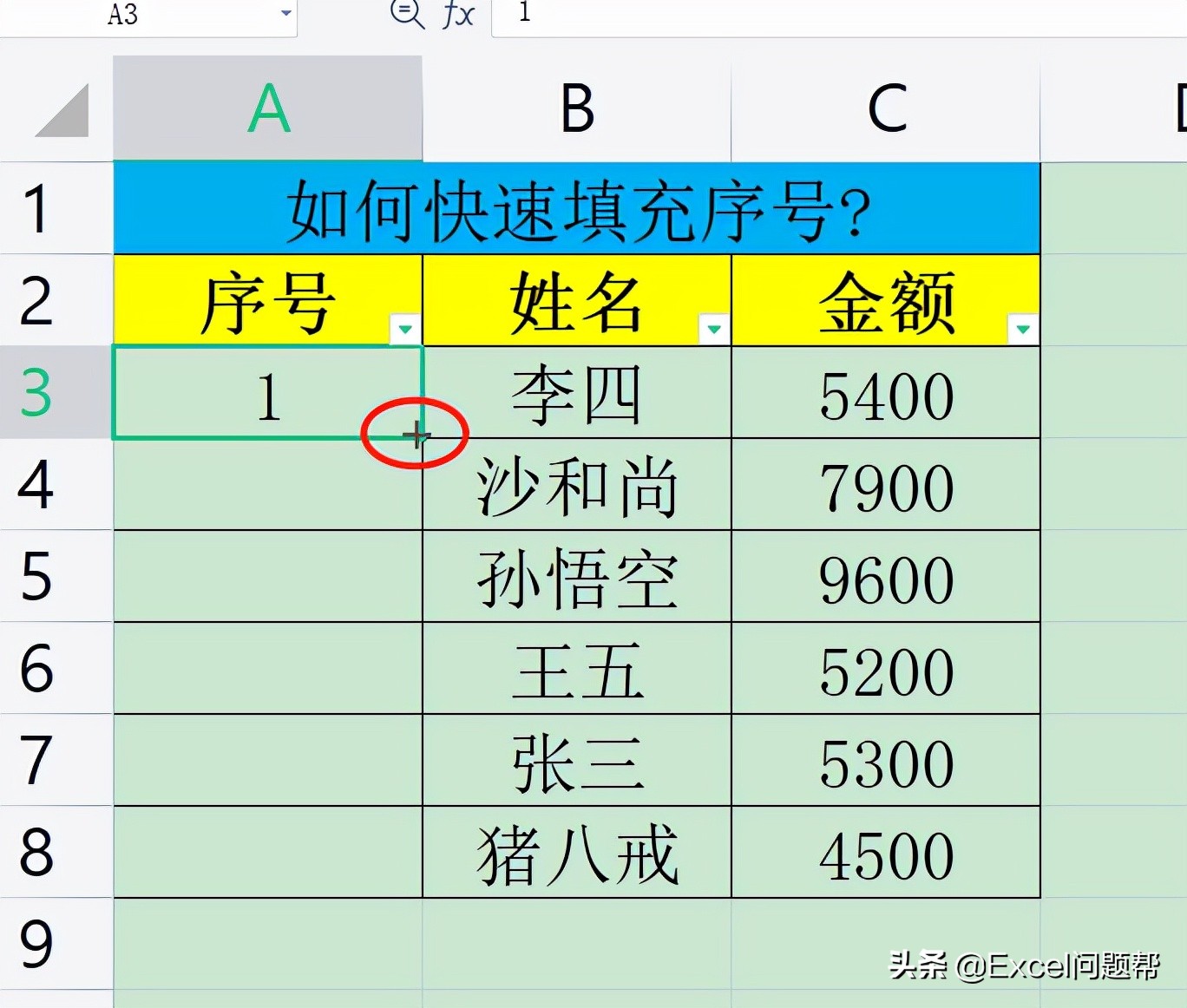 开篇之前,我们先来复习一遍最基础的直接下拉法。当然,如果还有一个个使用手工输入序号的朋友,我很佩服你的毅力,也请你一定要关注我,让我帮你释放更多时间!