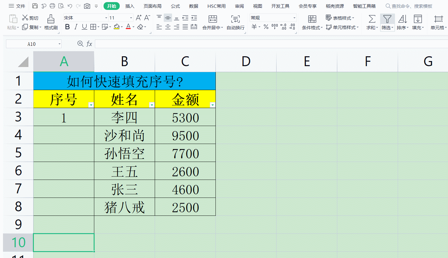 注意:记得跟前面讲述的一样,先在序号开始行录入个数字1,此必不可少!