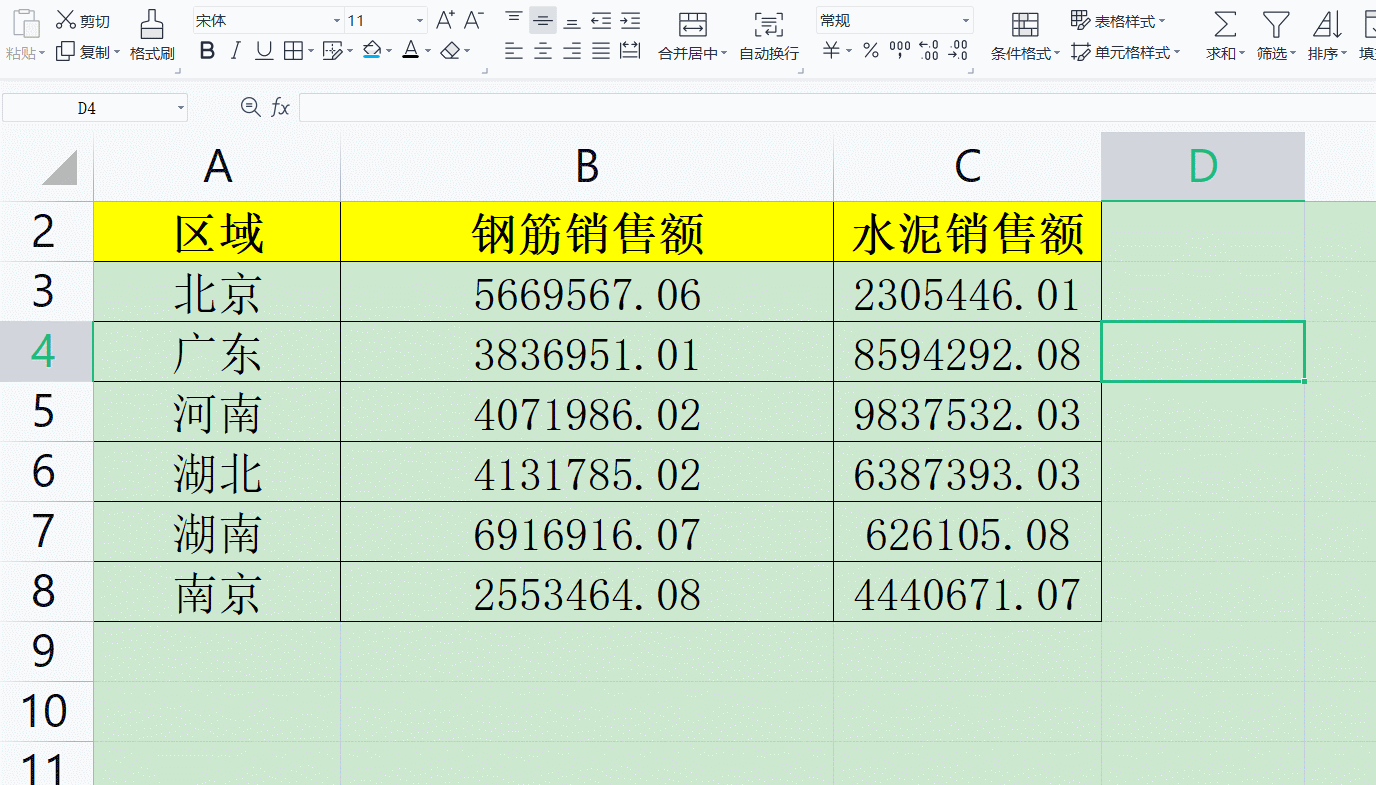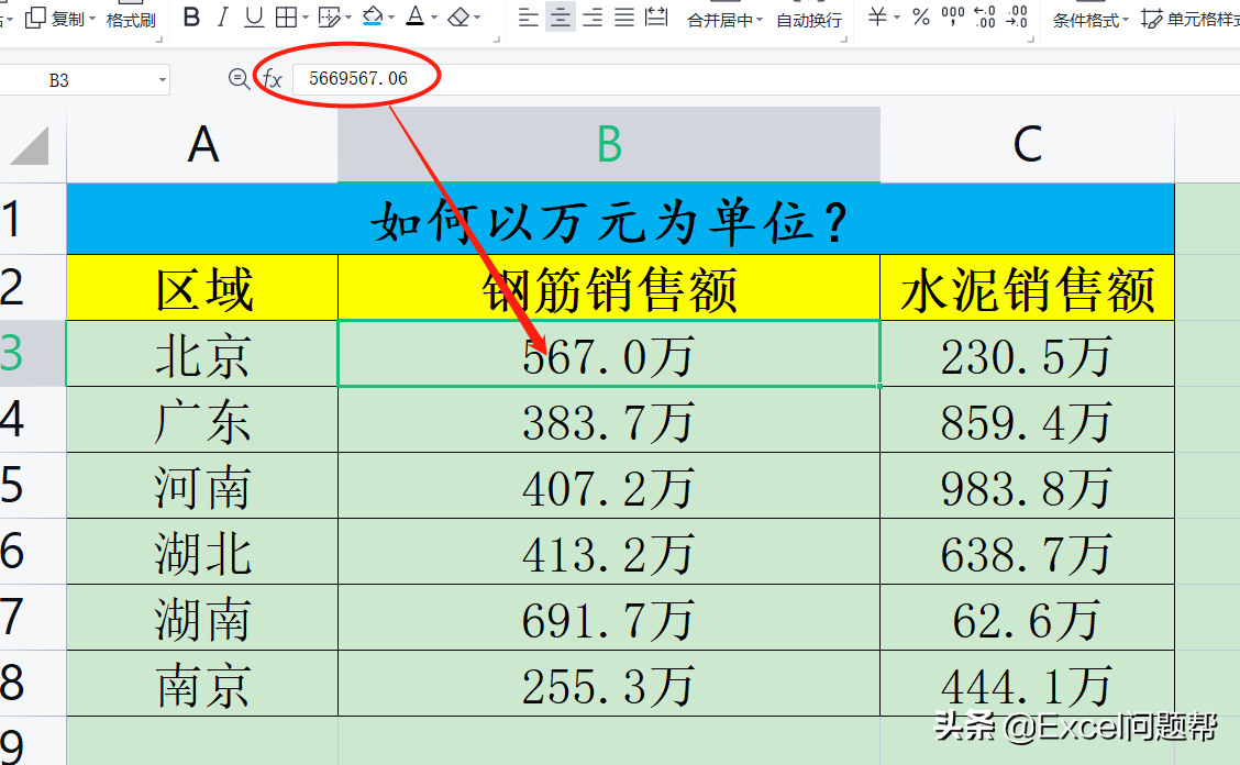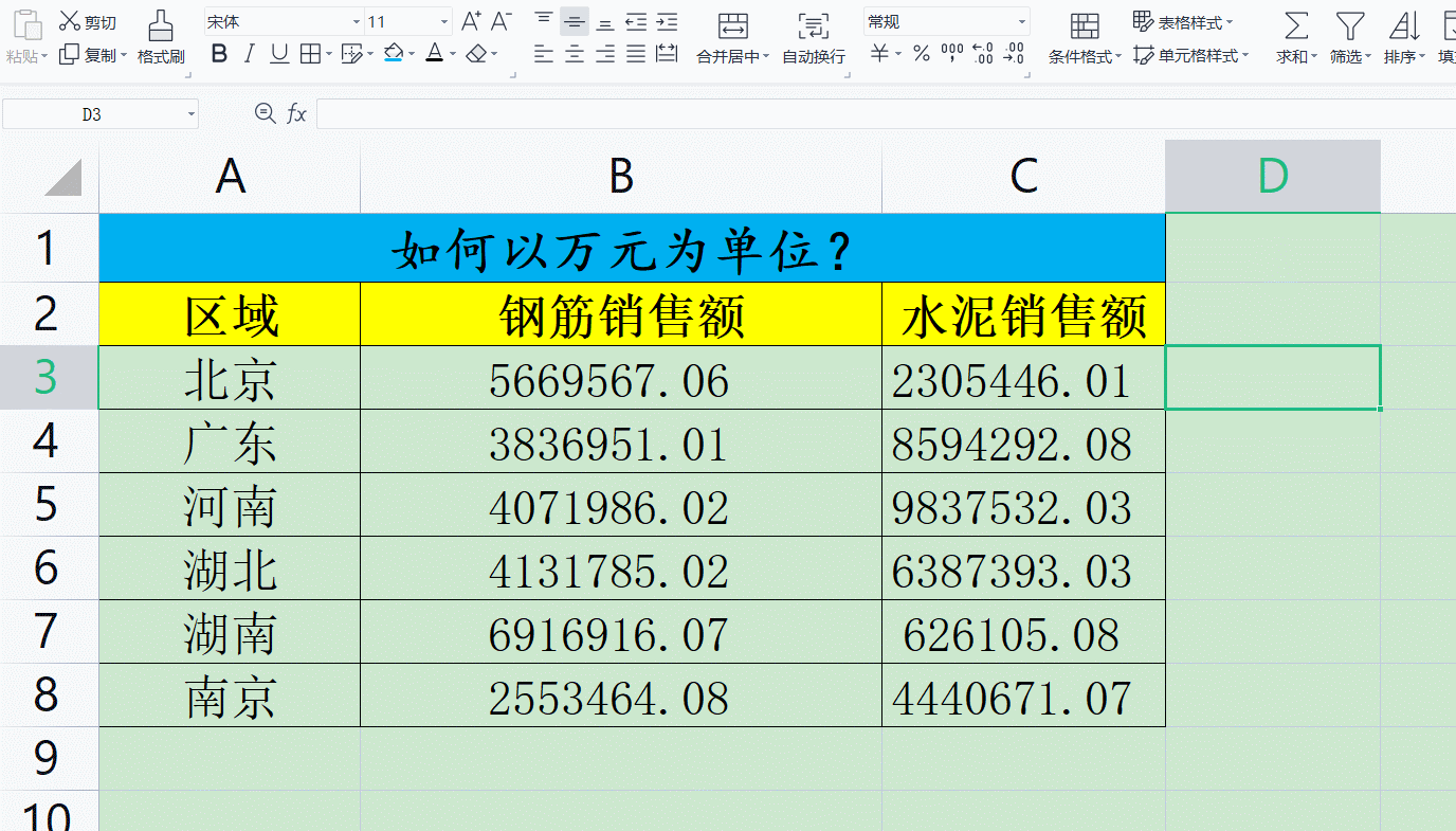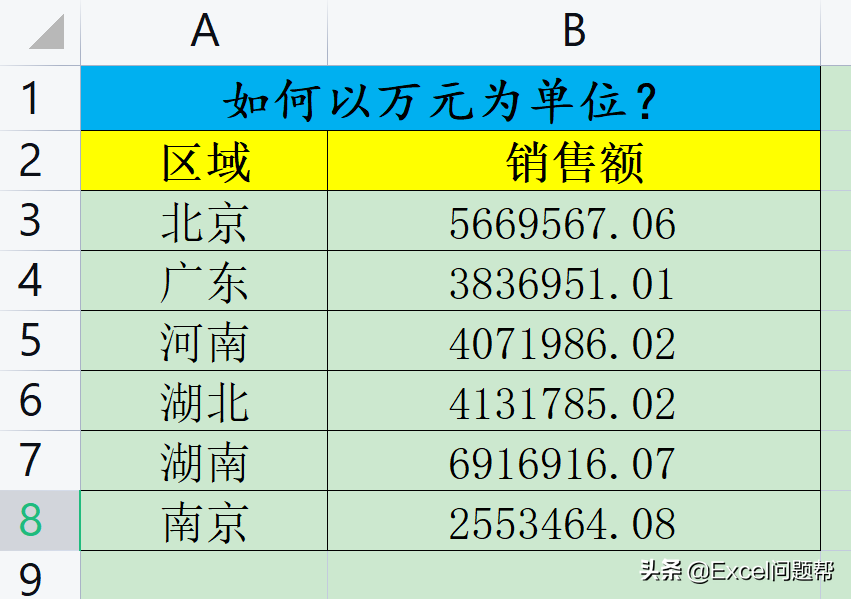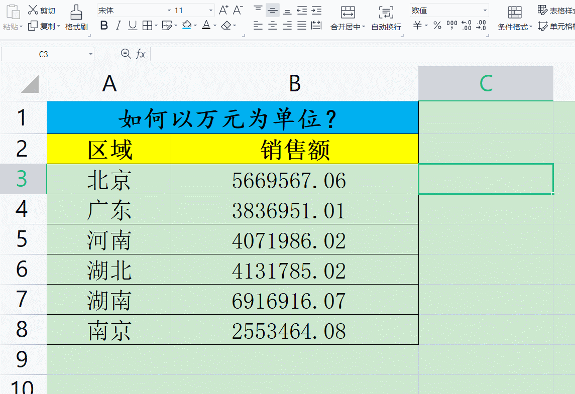 如下面表格中,有几个区域的销售额,但是获取到数据后是以元为单位的,密密麻麻的数字自己都一时半会区分不了到底是多少钱,更别提在向领导汇报工作时候让领导去看了。这是个典型场景,我们需要转化成以万元为单位。那么,如何将这种数字改成“万元”呢?