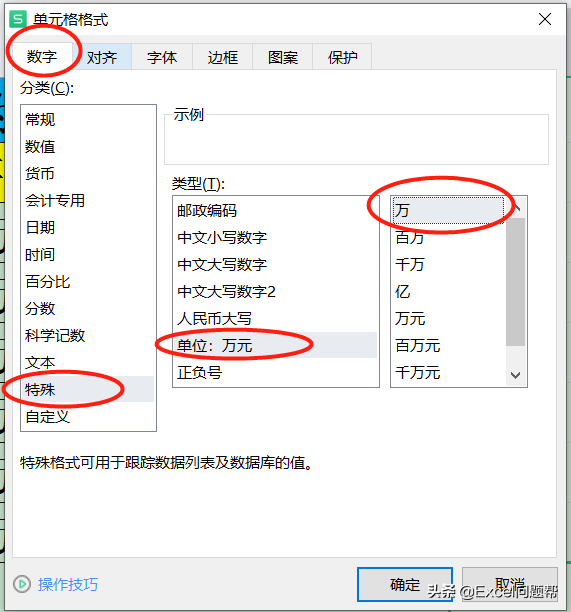 第三步:在弹出来的窗口,以此选择【数字】-【特殊】-【单位:万元】-【万】。
