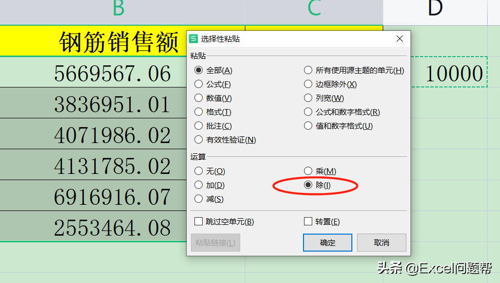 l 第三步,在弹出来的窗口中【运算】栏中选择【除】,然后确定即可。