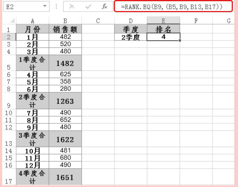 表格中按月份统计了销售额,其中包括季度小计,要求通过公式返回指定季度的销售额在4个季度中的名次。