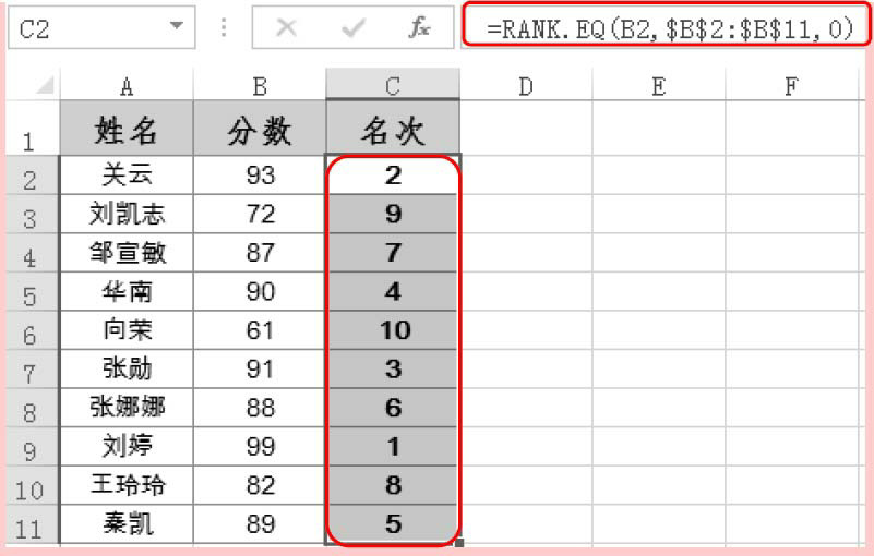 =RANK.EQ(B2,$B$2:$B$11,0)