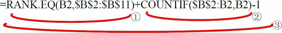 =RANK.EQ(B2,$B$2:$B$11)+COUNTIF($B$2:B2,B2)-1