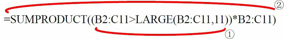 =SUMPRODUCT((B2:C11>LARGE(B2:C11,11))*B2:C11)