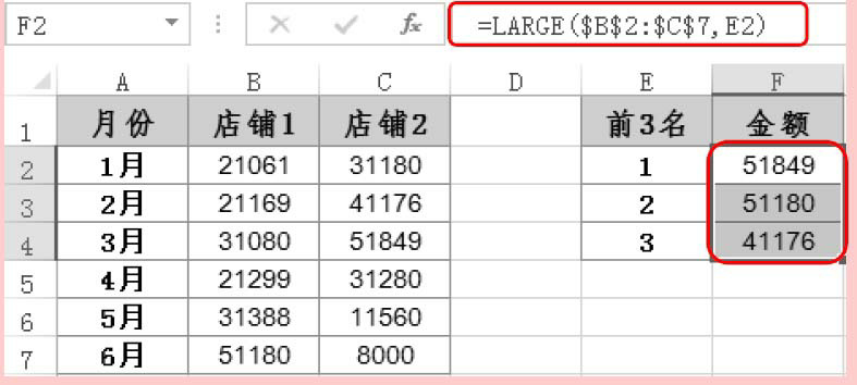 表格中统计了1~6月中两个店铺的销售金额,现在需要查看排名前3位的销售金额为多少,即得到F2:F4单元格区域中的值。