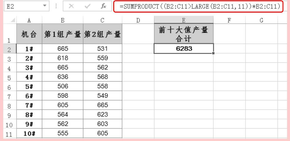 表格按不同机台分别统计了第1组和第2组的产量值,可以使用LARGE函数与SUMPRODUCT函数计算排名前10位的产品的合计值。