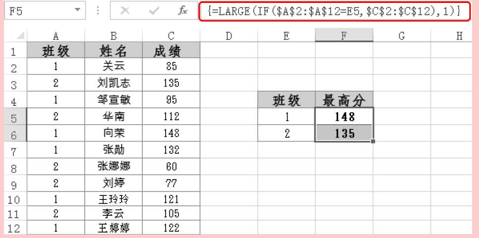 ➋ 选中F5单元格,向下复制公式到F6单元格中,可以快速返回“2”班级最高分,如图2所示。