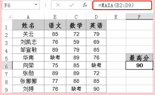 在学生考试成绩统计表中存在缺考的情况,对于缺考的学生,使用了“缺考”标记。如果要统计考试成绩中的最高分数,需要使用MAXA函数(如果无文字标记可以直接使用MAX函数)。