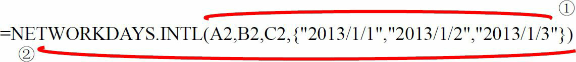 =NETWORKDAYS.INTL(A2,B2,C2,{“2013/1/1″,”2013/1/2″,”2013/1/3”})