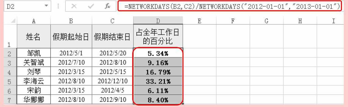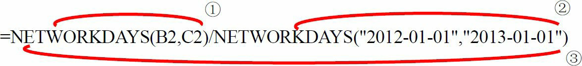 =NETWORKDAYS(B2,C2)/NETWORKDAYS(“2012-01-01″,”2013-01-01”)