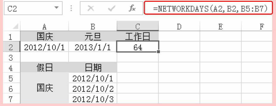 A2和B2单元格中的日期值分别为开始日期和终止日期,B5:B7单元格区域为不在工作日中的国庆假期。然后使用NETWORKDAYS函数返回两个日期间的工作日数,并且去除指定的法定假日。