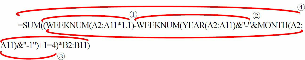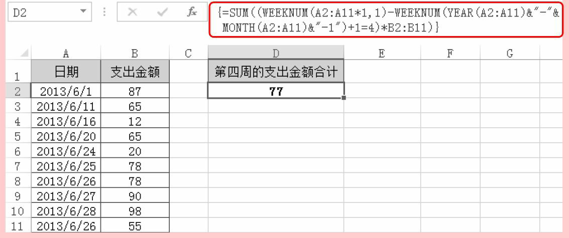 =SUM((WEEKNUM(A2:A11*1,1)-WEEKNUM(YEAR(A2:A11)&”-“&MONTH(A2:A11)&”-1″)+1=按“Shift+Ctrl+Enter”组合键即可返回当月第四周的支出金额合计,如图2所示。