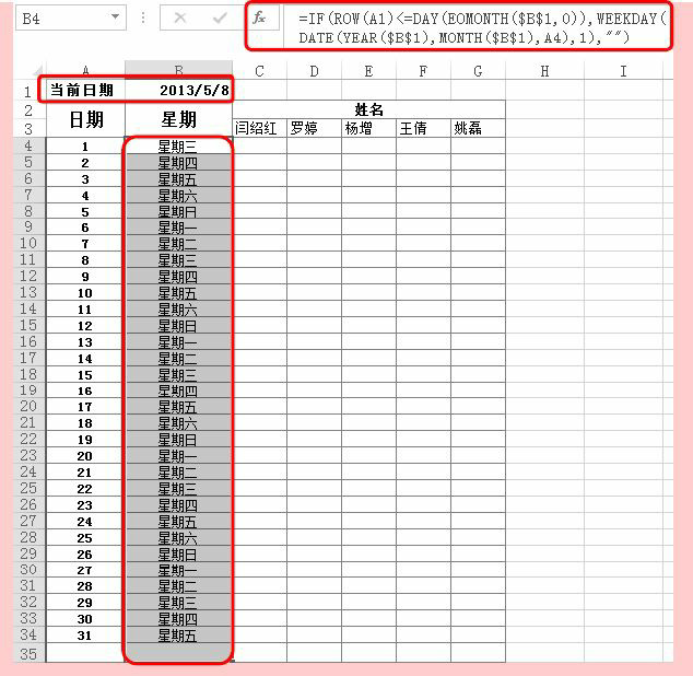 在考勤表中除了可以根据当前月份自动返回各日期,同时还可以返回各日期对应的星期数,此时可以配合使用如下多个函数来达成。