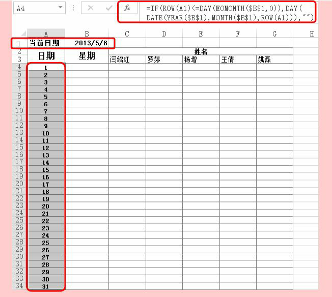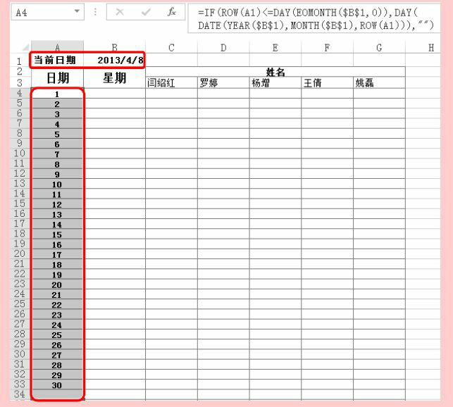 按“Enter”键即可根据A1单元格中的当前日期返回其对应的日期,将光标移到A4单元格的右下角,光标变成十字形状后,按住鼠标左键向下拖动进行公式填充,即可返回当月的其他日期,如图3所示。