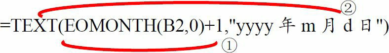 =TEXT(EOMONTH(B2,0)+1,”yyyy年m月d日”)