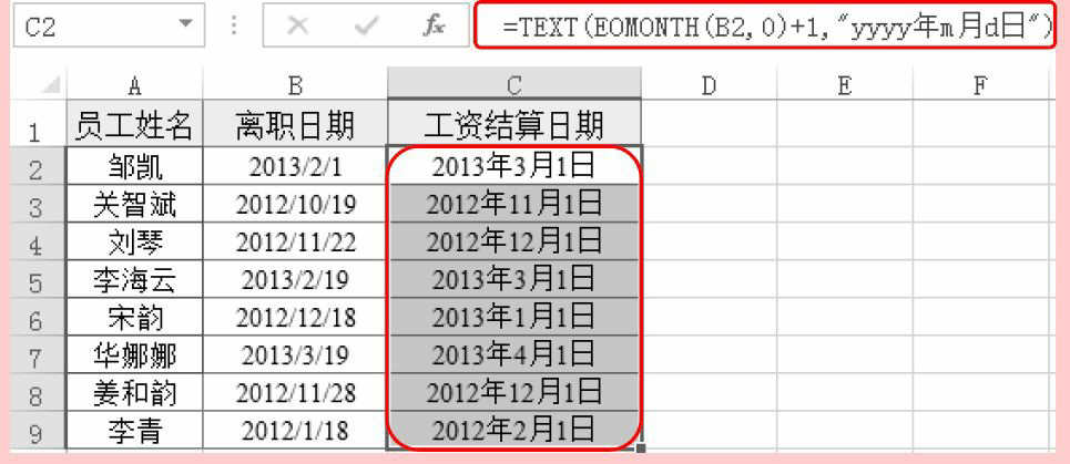 ➋ 将光标移到C2单元格的右下角,光标变成十字形状后,按住鼠标左键向下拖动进行公式填充,即可返回其他离职人员的工资结算日期,如图2所示。