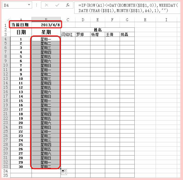 =IF(ROW(A1)<=DAY(EOMONTH($B$1,0)),WEEKDAY(DATE(YEAR($B$1),MONTH($B$1),A4),按“Enter”键即可根据A1单元格中的当前日期返回其对应的星期数,将光标移到A4单元格的右下角,光标变成十字形状后,按住鼠标左键向下拖动进行公式填充,即可返回其他日期对应的星期数,如图5所示。