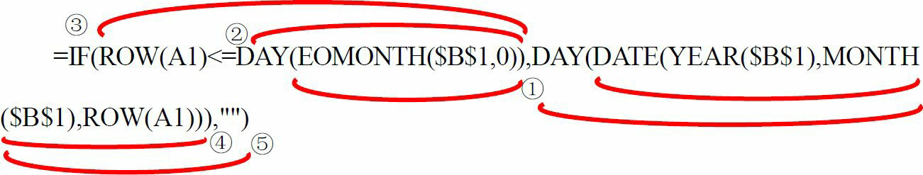 ④ 提取B1单元格中给定日期的年份、月份并与ROW(A1)组成一个日期值。