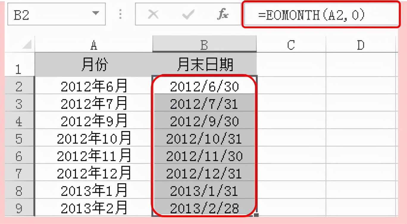 ➋ 将光标移到B2单元格的右下角,光标变成十字形状后,按住鼠标左键向下拖动进行公式填充,即可返回其他月份对应的月末日期,如图1所示。