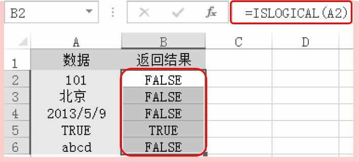 ➋ 将光标移到B2单元格的右下角,待光标变成十字形状后,按住鼠标左键向下拖动进行公式填充,即可判断出其他数值是否为逻辑值,如图3所示。