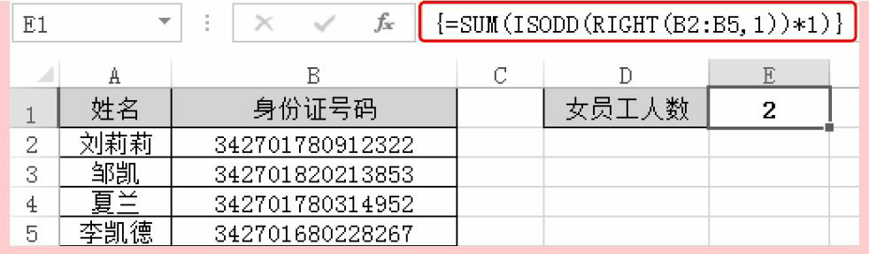 在15位身份证号码中,最后一位如果为偶数,表示持证人性别为“女”,反之为“男”,因此可以根据此特征来变相统计公司女性员工人数。