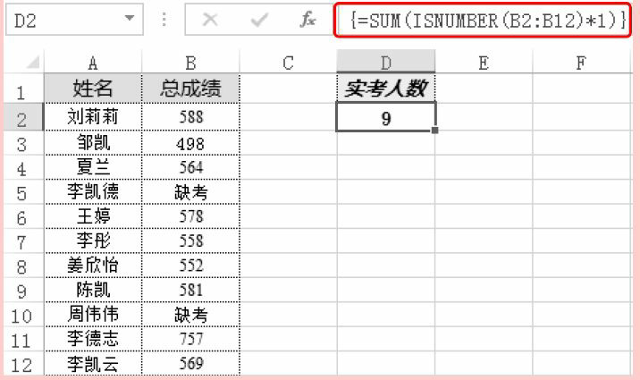 本例表格中统计了学生成绩,并对缺考情况进行了标记。使用ISNUMBER函数配合SUM函数可以快速统计出实考人数的合计值。