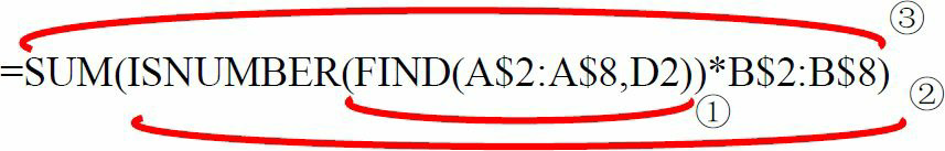 =SUM(ISNUMBER(FIND(A$2:A$8,D2))*B$2:B$8)