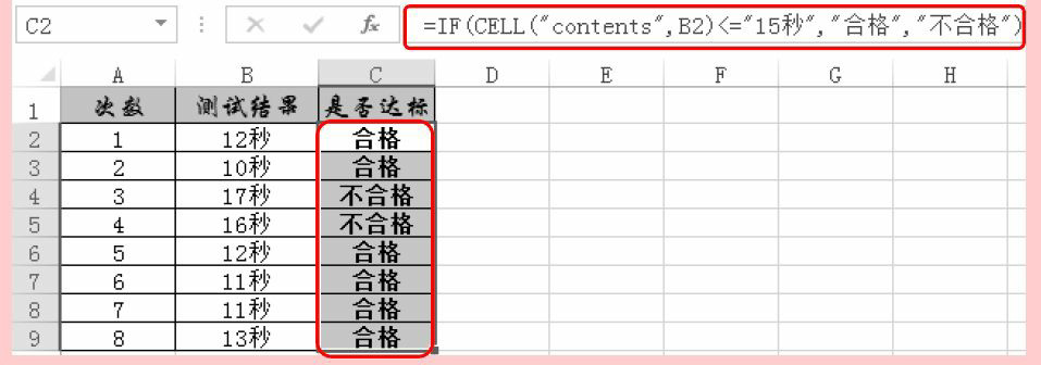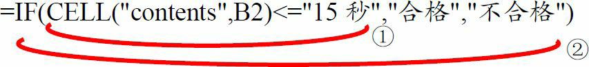 =IF(CELL(“contents”,B2)<=”15秒”,”合格”,”不合格”)